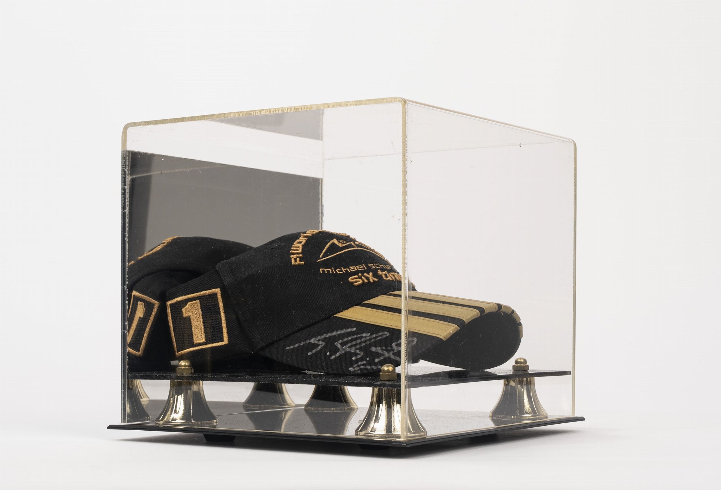 Cappellino firmato da Michael Schumacher, con “Lettera di autenticità” della PSA/DNA e contenuto in un’elegante teca. Il cappellino è quello prodotto per celebrare il sesto titolo vinto da Schumacher in Formula 1 nel 2003, il terzo con la scuderia Ferrari. Michael Schumacher è considerato uno dei migliori piloti di tutti i tempi in Formula 1. Ha vinto 7 titoli mondiali, i primi due con la Benetton (1994 e 1995) e successivamente cinque consecutivi con la Ferrari (2000, 2001, 2002, 2003 e 2004), quest'ultimo un record assoluto. È al secondo posto per numero di gare vinte (91), podi (155) e pole position (68), in tutte e tre le graduatorie dietro al solo Hamilton. Il 29 dicembre 2013 è rimasto gravemente ferito in un incidente su una pista da sci a Méribel e dal quale non si è ancora ripreso.