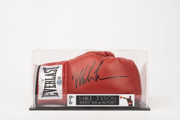 Guantone da boxe rosso Everlast firmato da Mike Tyson con doppia autentica: Beckett e bollino ufficiale del merchandise di Mike Tyson. In teca, con targa nominale. Michael Gerard Tyson (New York, 30 giugno 1966) è un ex pugile statunitense, soprannominato 'Iron Mike”, che è considerato uno dei migliori pugili di tutti i tempi, campione del mondo dei pesi massimi dal 1986 al 1990, con una breve parentesi nel 1996. Tyson vinse i suoi primi 19 incontri per KO, 12 dei quali alla prima ripresa. Nel 1986, all'età di 20 anni 4 mesi e 22 giorni, conquistò la corona WBC contro Trevor Berbick, divenendo il più giovane campione del mondo dei pesi massimi, record che tuttora rimane imbattuto. Un anno dopo vinse anche i titoli WBA ed IBF, divenendo campione indiscusso ed il primo peso massimo ad unificare i campionati del mondo. Memorabili anche le sue sconfitte soprattutto quelle contro Evander Holyfield: passata alla storia la rivincita quando Tyson fu squalificato per aver morso le orecchie dell'avversario staccandogli un pezzo di cartilagine dell'orecchio destro.