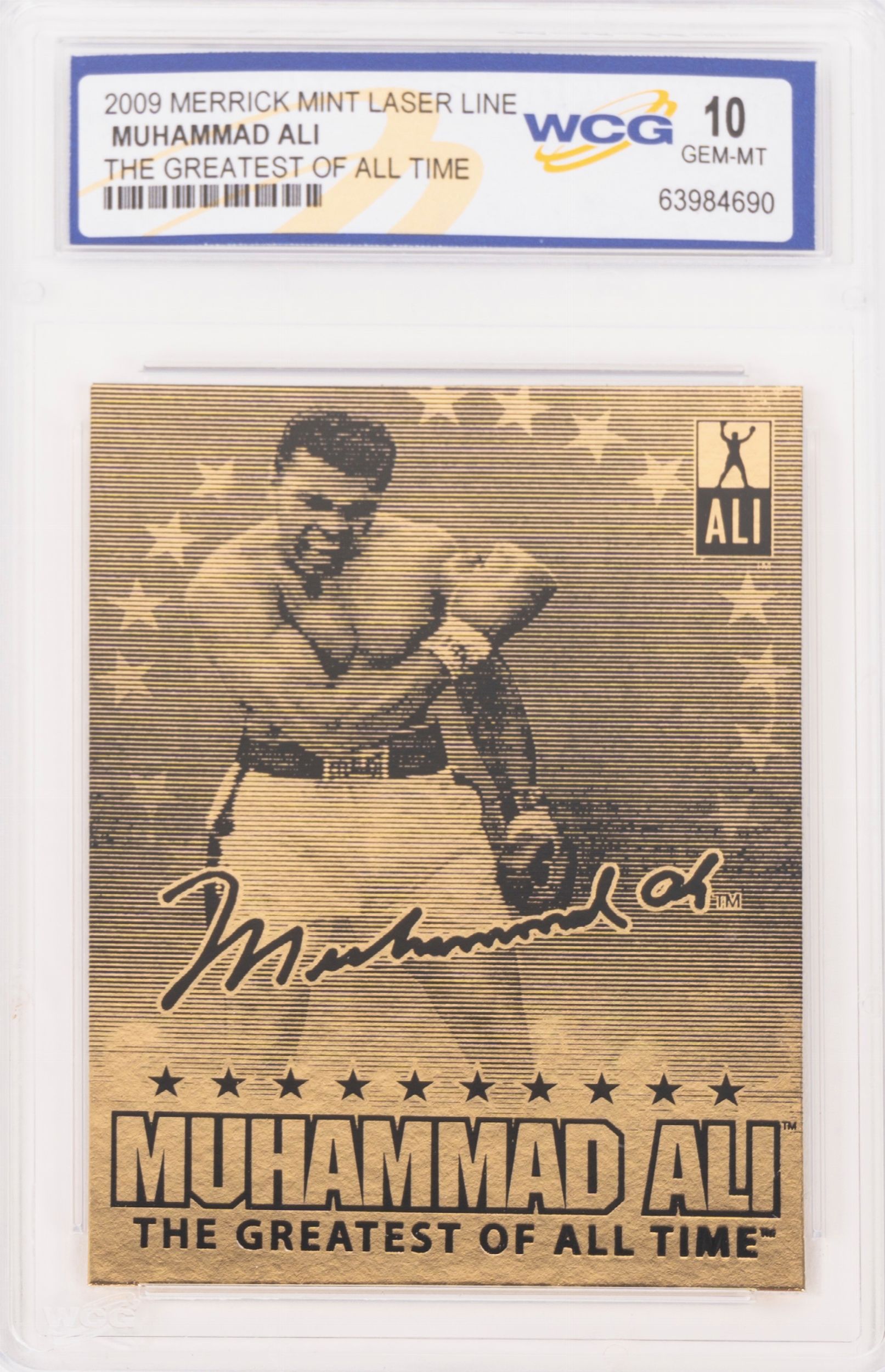 Card a tiratura limitata dedicata a Muhammad Ali e prodotta dalla Merrick Mint nel 2009. Gradata dalla WCG con il grado massimo di 10. Muhammad Ali, nato Cassius Marcellus Clay Jr. il 17 gennaio 1942 a Louisville, Kentucky, e scomparso il 3 giugno 2016 a Scottsdale, Arizona, è stato un pugile professionista americano e attivista per i diritti civili. Considerato uno dei più grandi pugili di tutti i tempi, Ali è stato un'icona globale e una figura controversa per tutta la sua carriera. Ali ha dominato la divisione dei pesi massimi per la maggior parte degli anni '60 e '70, vincendo il titolo tre volte e difendendolo con successo 19 volte. Si è convertito all'Islam nel 1964 e ha cambiato il suo nome da Cassius Clay a Muhammad Ali. Le sue convinzioni religiose e il suo rifiuto di essere arruolato nella guerra del Vietnam lo resero una figura controversa, ma la sua personalità carismatica e le sue abilità pugilistiche lo resero anche uno degli sportivi più popolari al mondo. Ali è considerato uno dei più grandi pugili di tutti i tempi, e il suo impatto sul mondo dello sport va ben oltre il ring. È stato un'icona globale e un simbolo di resistenza e ispirazione per milioni di persone in tutto il mondo.