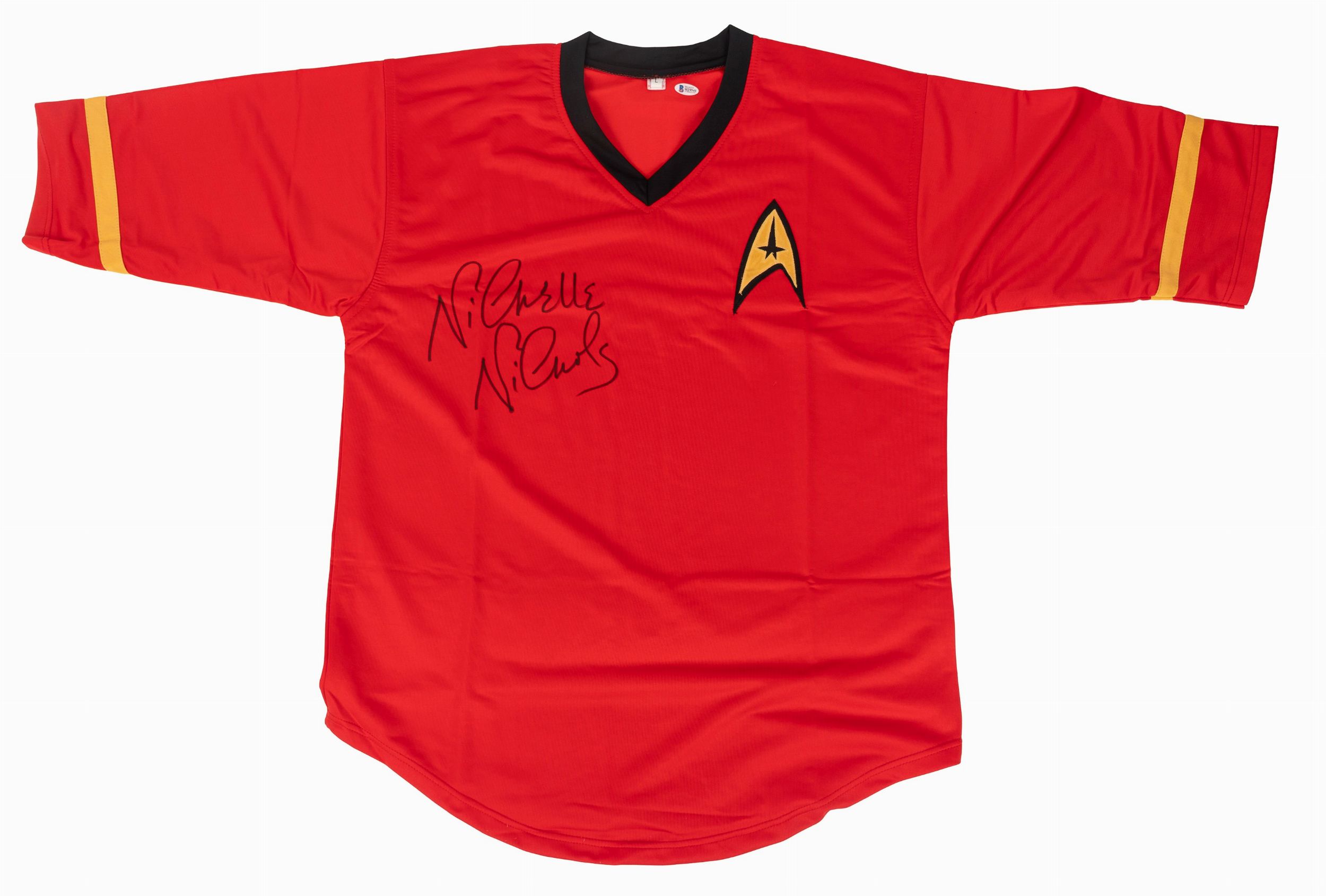 Replica di un’uniforme di Star Trek autografata da Nichelle Nichols, il tenente Uhura della prima serie tv. Nichelle Nichols (1924-2022) è stata un'attrice, cantante e ballerina americana, conosciuta soprattutto per il suo ruolo di Nyota Uhura nella serie televisiva originale di Star Trek (1966-1969). La sua interpretazione di Uhura, un ufficiale di comunicazione e linguista afroamericana, è stata rivoluzionaria per la televisione dell'epoca e ha contribuito a sfidare i pregiudizi razziali e di genere. Uhura era un personaggio chiave nella serie originale di Star Trek. Era un membro intelligente e capace dell'equipaggio dell'Enterprise, e il suo ruolo era fondamentale per la comunicazione e la diplomazia della nave. È stata quindi una delle prime attrici afroamericane ad avere un ruolo importante e non stereotipato in una serie televisiva. Oltre a Star Trek, la Nichols ha avuto una lunga e prolifica carriera nel mondo dello spettacolo, recitando in film, televisione e teatro. Era anche un'attivista per i diritti civili e per l'uguaglianza razziale. E ha lavorato con la NASA per reclutare afroamericani nel programma spaziale.