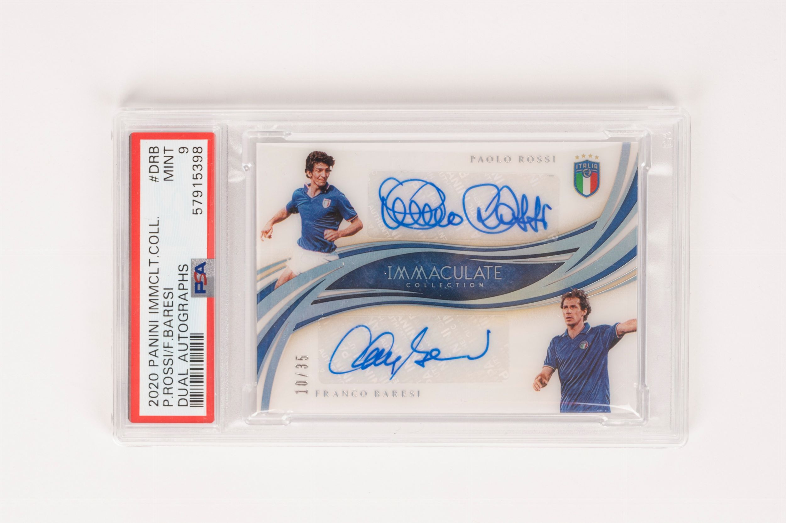 Card autografata di Paolo Rossi e Franco Baresi con la maglia della nazionale italiana, pubblicata dalla Panini nel 2020 per la serie Immaculate Collection. Tiratura di soli 35 esemplari. Certificata dalla PSA/DNA. Paolo Rossi è passato alla storia per aver guidato la Nazionale italiana alla vittoria nella Coppa del Mondo FIFA del 1982. Durante quel torneo, Rossi ha segnato sei gol, guadagnandosi il titolo di capocannoniere e il Pallone d'Oro come miglior giocatore del torneo. Franco Baresi è un ex calciatore italiano, considerato uno dei migliori difensori della storia del calcio. Ha trascorso la maggior parte della sua carriera con il Milan, dove è diventato una leggenda del club. Inoltre, ha rappresentato la Nazionale italiana in molte competizioni internazionali, diventando un punto fermo della difesa.
