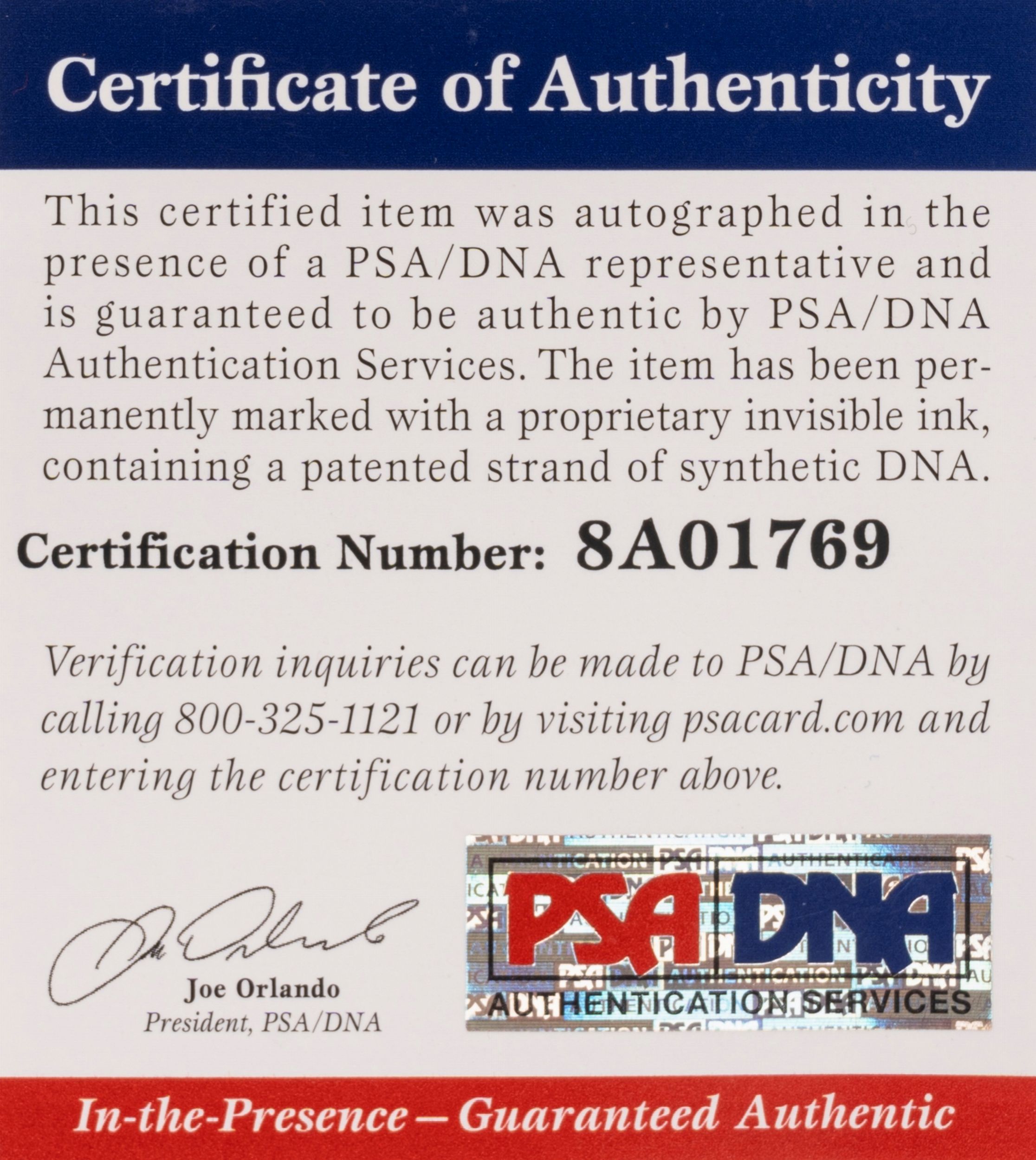 Maglia replica del Brasile autografata da Pelé e certificata dalla PSA/DNA. Pelé, pseudonimo di Edson Arantes do Nascimento (Três Corações, 23 ottobre 1940 – San Paolo, 29 dicembre 2022), è stato un calciatore brasiliano, di ruolo centrocampista o attaccante, considerato il più forte calciatore della storia. Da calciatore ha legato la sua carriera principalmente al Santos, con cui ha vinto dieci volte il campionato Paulista, quattro il Torneo Rio-San Paolo, sei il Campeonato Brasileiro Série A (cinque, peraltro consecutive, la Taça Brasil e una il Torneo Roberto Gomes Pedrosa), oltre a due edizioni della Copa Libertadores, altrettante della Coppa Intercontinentale e la prima edizione (su due disputate) della Supercoppa dei Campioni Intercontinentali. Trasferitosi negli Stati Uniti d'America nella parte finale di carriera, ha conquistato un Campionato NASL con i New York Cosmos. Con 37 trofei conquistati, è uno dei dieci giocatori più titolati della storia del calcio. È l'unico calciatore al mondo ad aver vinto tre edizioni del campionato mondiale di calcio, evento avvenuto con la nazionale brasiliana nel 1958, 1962 e 1970. La FIFA gli riconosce il record di reti realizzate in carriera, 1281 in 1363 partite, mentre in gare ufficiali ha messo a segno 757 reti in 816 incontri con una media realizzativa pari a 0,93 gol a partita.