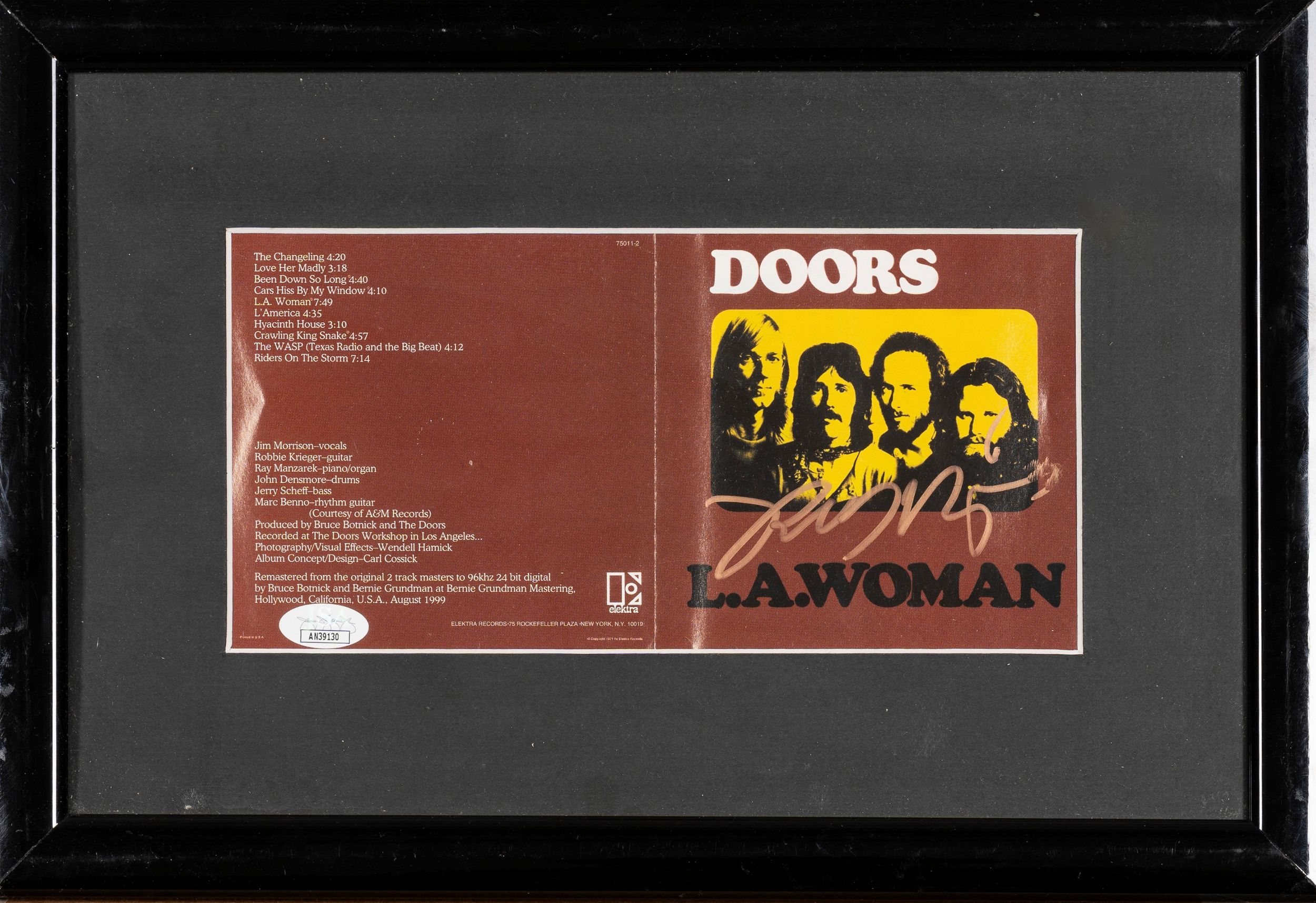 Booklet del cd L.A. Woman dei Doors autografato da Robby Krieger con certificazione della JSA. Già incorniciato. Robby Krieger, nato a Los Angeles il 8 gennaio 1946, è un chitarrista e cantautore americano, noto soprattutto come membro fondatore della leggendaria band rock The Doors. Nel 1965, mentre frequentava l'UCLA, Krieger incontra Jim Morrison, un poeta carismatico con un sogno: formare una band rock. Insieme a Ray Manzarek (tastiere) e John Densmore (batteria), danno vita ai Doors. Krieger è il principale autore di canzoni dei Doors, scrivendo o co-scrivendo la maggior parte dei loro successi. Con il suo stile unico e innovativo, caratterizzato da influenze jazz, blues e flamenco, Krieger ha contribuito a definire il sound distintivo dei Doors, creando riff iconici per canzoni come 'Light My Fire', 'Love Me Two Times' e 'Touch Me'. Robby Krieger è considerato uno dei chitarristi più influenti della sua generazione. Il suo stile unico e la sua creatività hanno contribuito a rendere i Doors una delle band rock più iconiche di tutti i tempi.