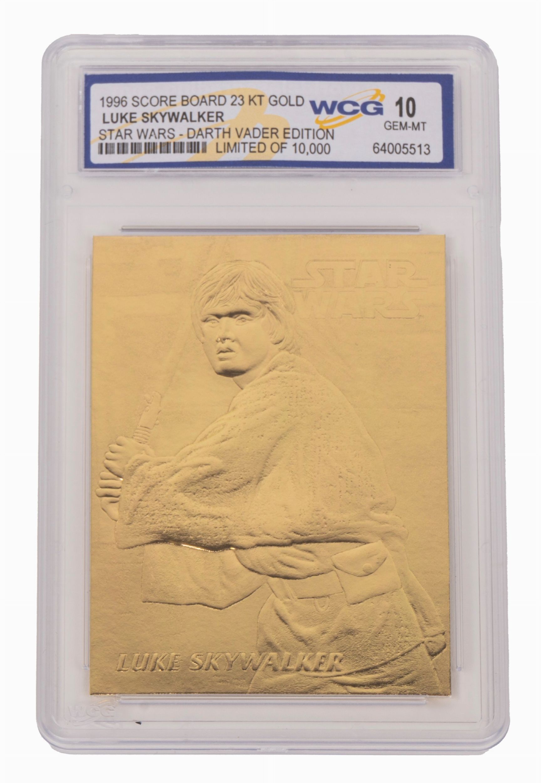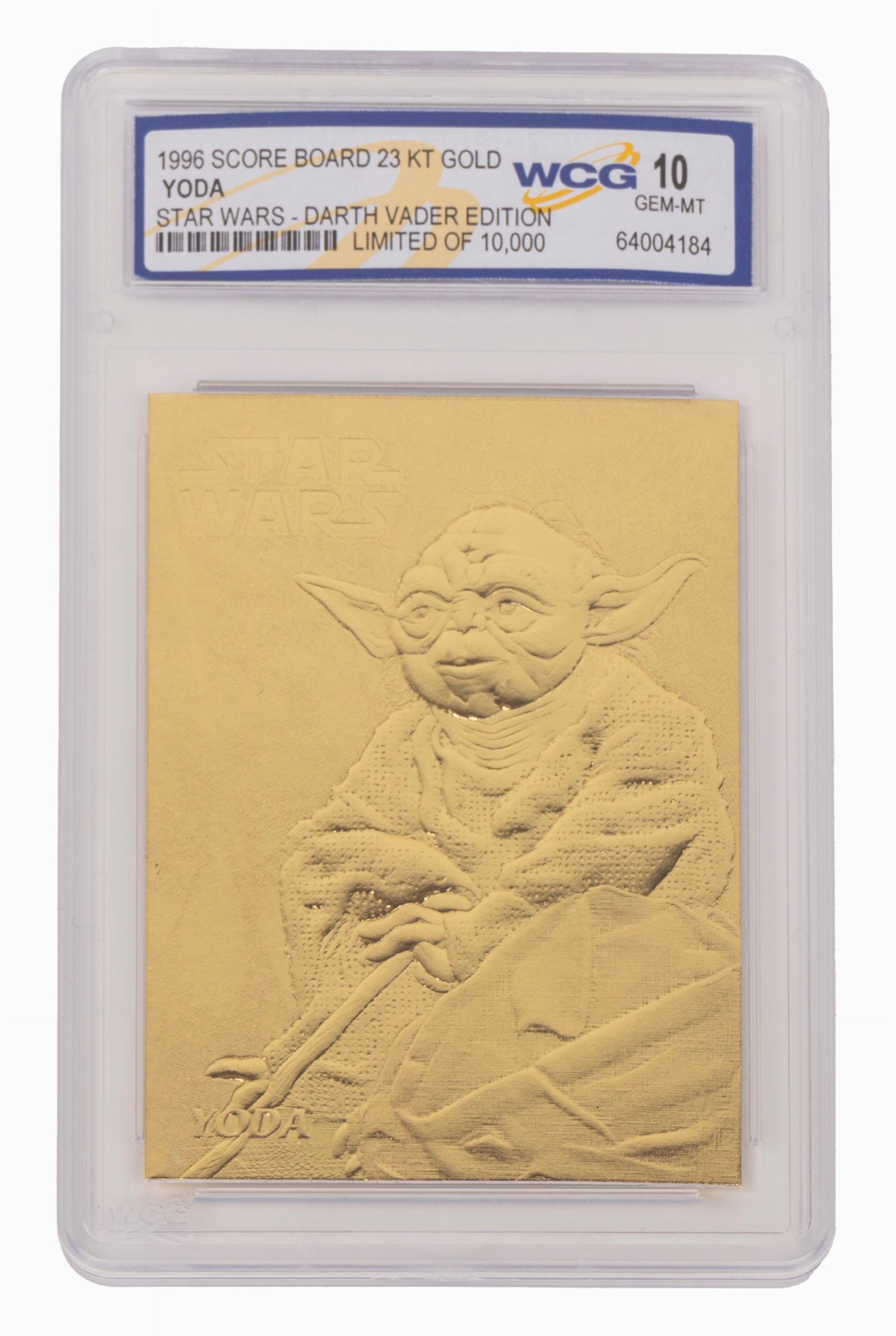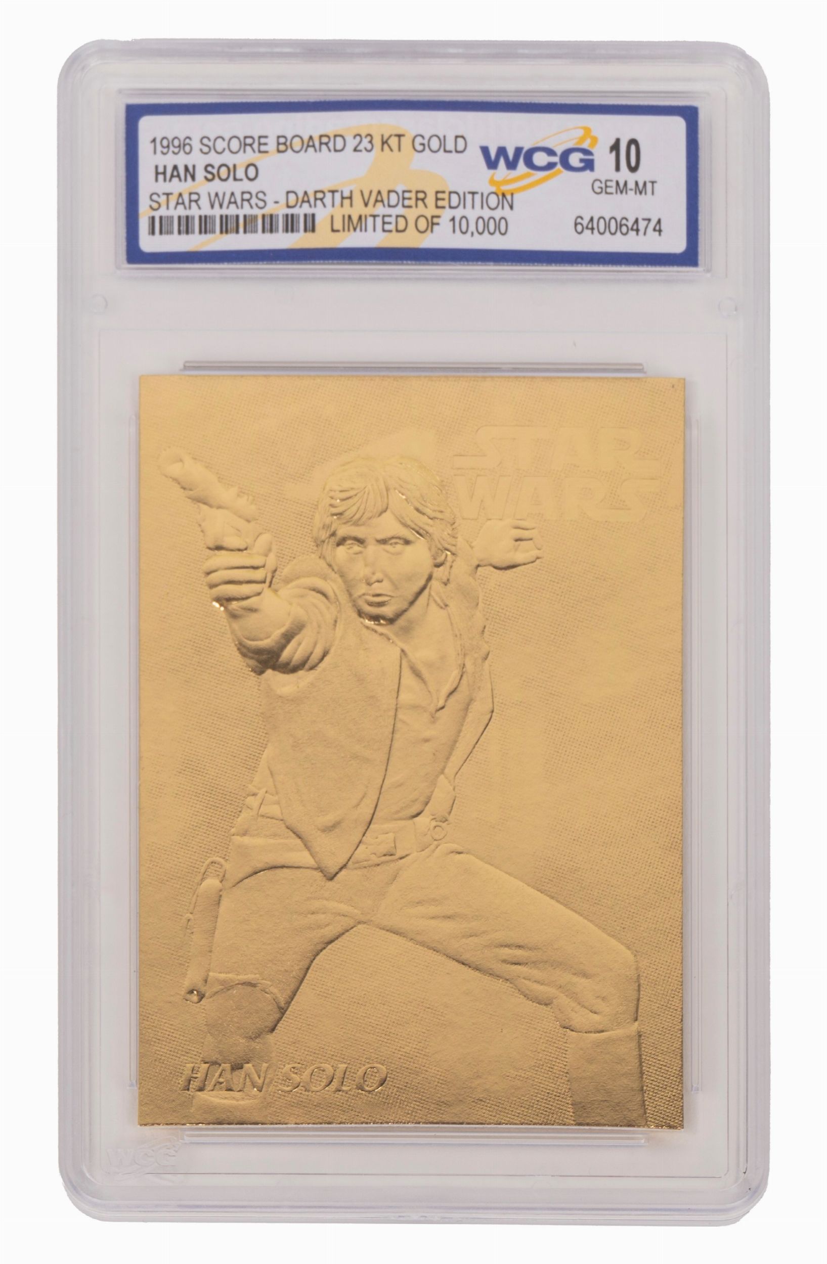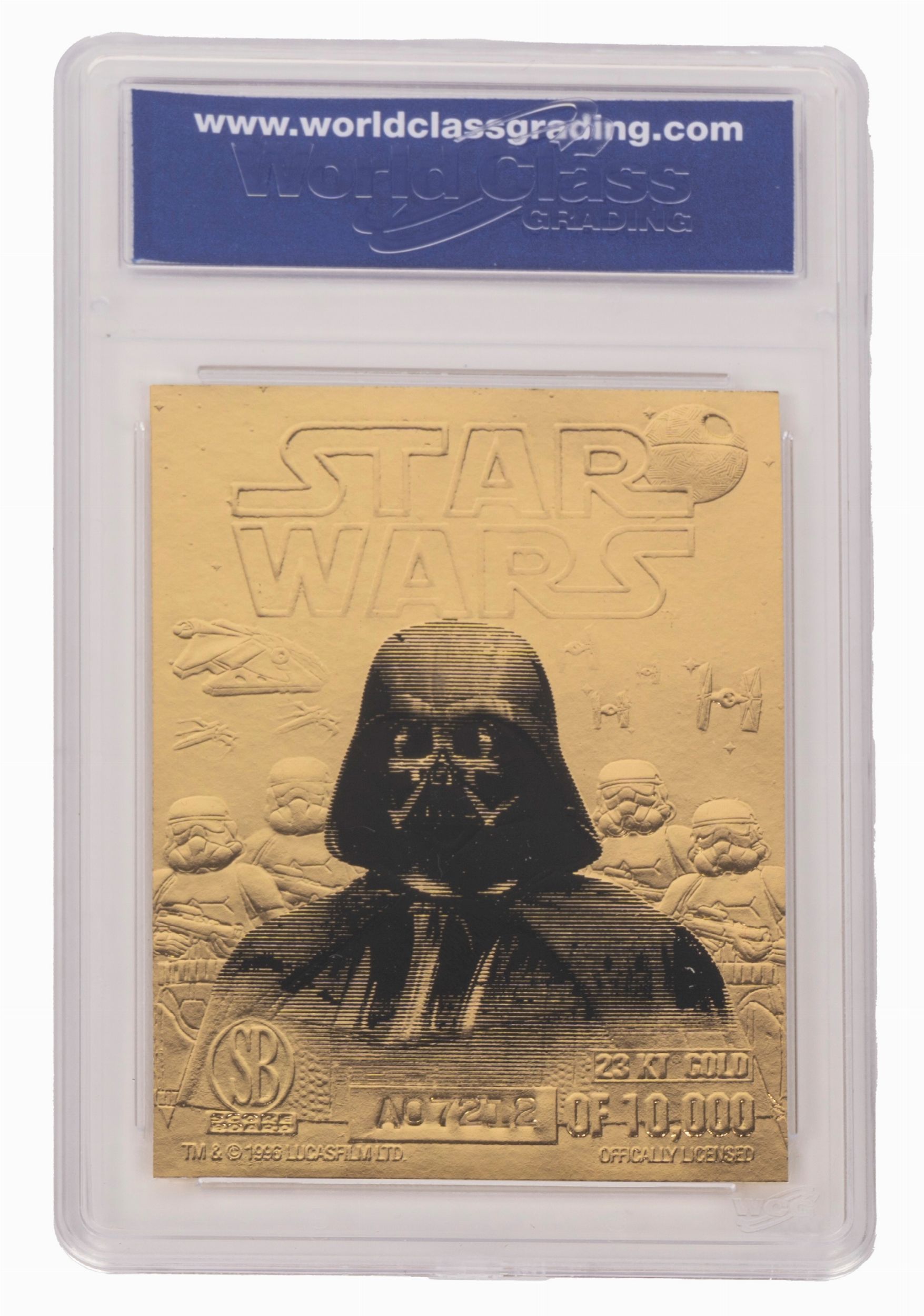 Lotto di 9 card su foglia d’oro 23K dedicate ai personaggi principali di Star Wars, valutate 10 dalla società americana WCG e prodotte a tiratura limitata nel 1996 dalla Sportstime. I presonaggi rappresentati sono: Luke Skywalker, Darth Vader, Han Solo, Princess Leia, Obi-Wan Kenobi, R2-D2 & C-3PO, Boba Fett, Yoda.