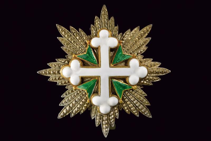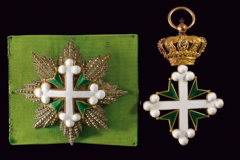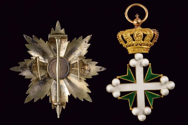 Regno d'Italia, dimensioni 6.5 - 10.1 - 8.8 x 8.8 cm. Fine del XIX Secolo Ordine dei Santi Maurizio e Lazzaro. Set di gran croce. Il pendente di gran croce in oro e smalti, la grande corona traforata e finemente cesellata. Placca in argento brillantato con applicazione in oro e smalti, spilla verticale con due ganci, marcato 'D