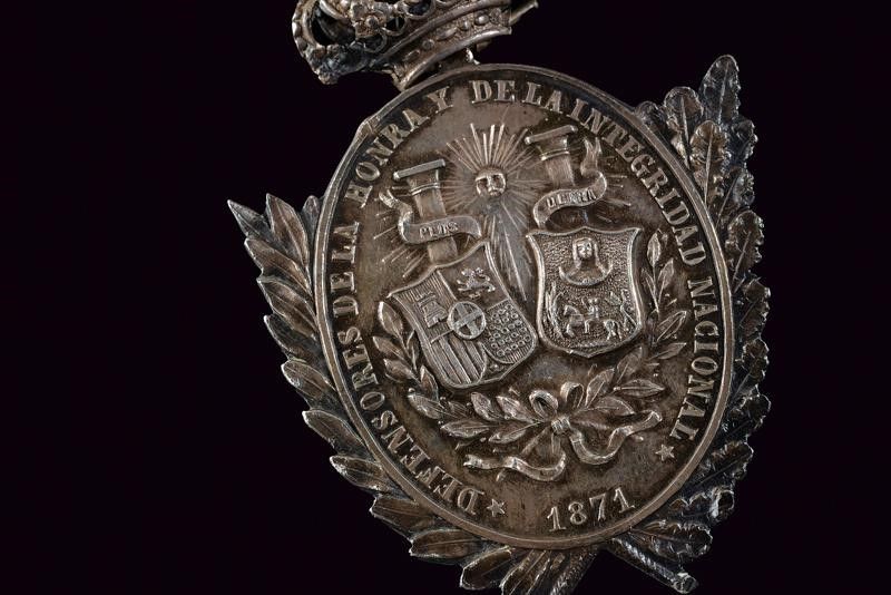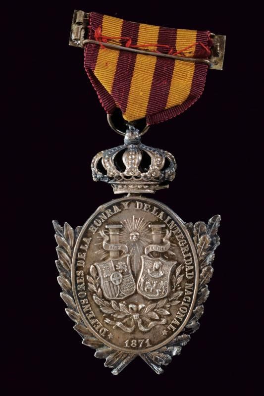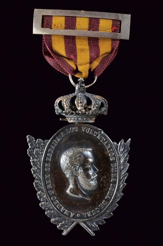 Spagna, dimensioni 5 x 7.2 cm. 1871 Medaglia ellittica in argento. Al recto testa a destra ed iscrizione 'AMADEO I REY DE ESPAÑA A LOS VOLUNTARIOS DE LA ISLA DE CUBA'. Al verso iscrizione 'DEFENSORES DE LA HONRA Y DE LA INTEGRIDAD NACIONAL' e '1871'. Al centro gli emblemi di Spagna e di Cub