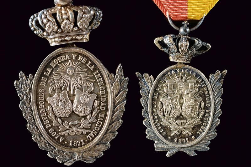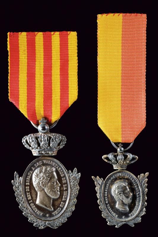 Spagna, dimensioni 2.4 x 3.5 - 3 x 4.8 cm. 1871 - 76 Due medaglie d'argento in formato ridotto. Di forma ellittica. Al recto testa a destra ed iscrizione 'AMADEO I REY DE ESPAÑA A LOS VOLUNTARIOS DE LA ISLA DE CUBA'. Al verso iscrizione 'DEFENSORES DE LA HONRA Y DE LA INTEGRIDAD NACIONAL' e '1871'. Al centr