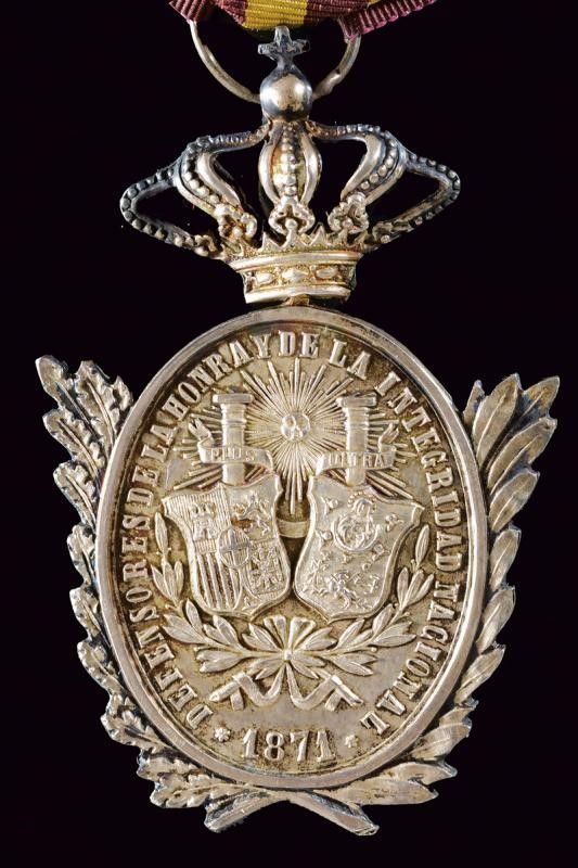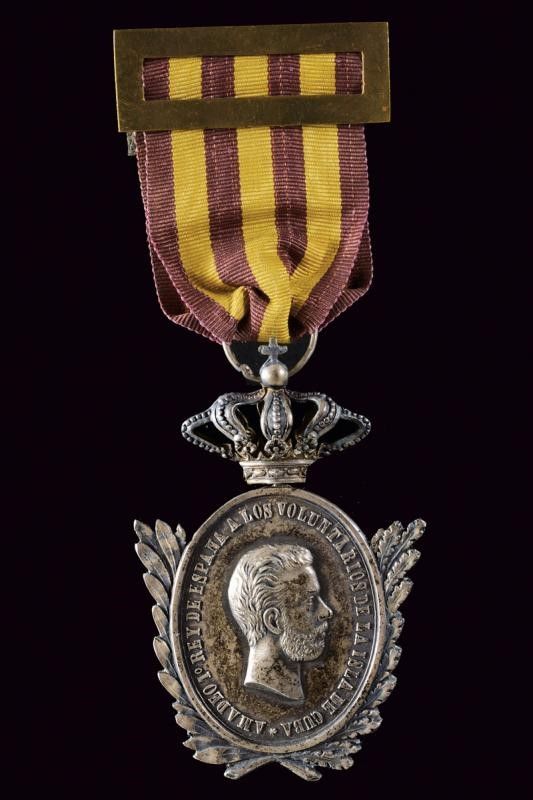 Spagna, dimensioni 5.1 x 6.7 cm. 1871 Medaglia ellittica in argento. Al recto, testa a destra ed iscrizione 'AMADEO I REY DE ESPAÑA A LOS VOLUNTARIOS DE LA ISLA DE CUBA'. Al verso, iscrizione 'DEFENSORES DE LA HONRA Y DE LA INTEGRIDAD NACIONAL' e '1871'. Al centro gli emblemi di Spagna e di C