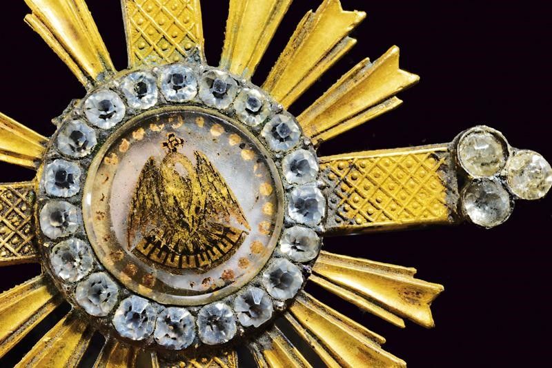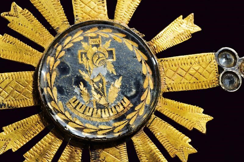 XIX Secolo Croce in metallo dorato ed inciso, recante al centro medaglione con giglio sormontato da croce, sul retro croce con rosa. Decorazioni in simil-pietre. Sopra corona con anello di sospensione. Rara.