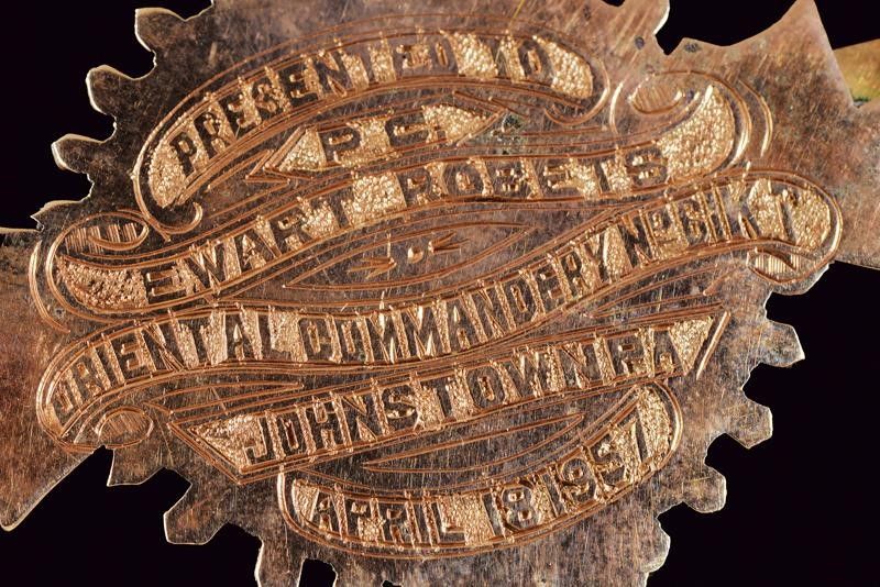 USA, dimensioni 5.7 x 10 cm. 1957 In oro giallo, argento e smalti. La superficie finemente incisa. Su corona snodata decorata con spade incrociate in argento. Sul retro dedica 'PRESENTED TO EWART ROBETS ORIENTAL COMMANDERY No GIK JOHNS TOWN PA APRIL 18, 1957'. 14 ct. 36 g.