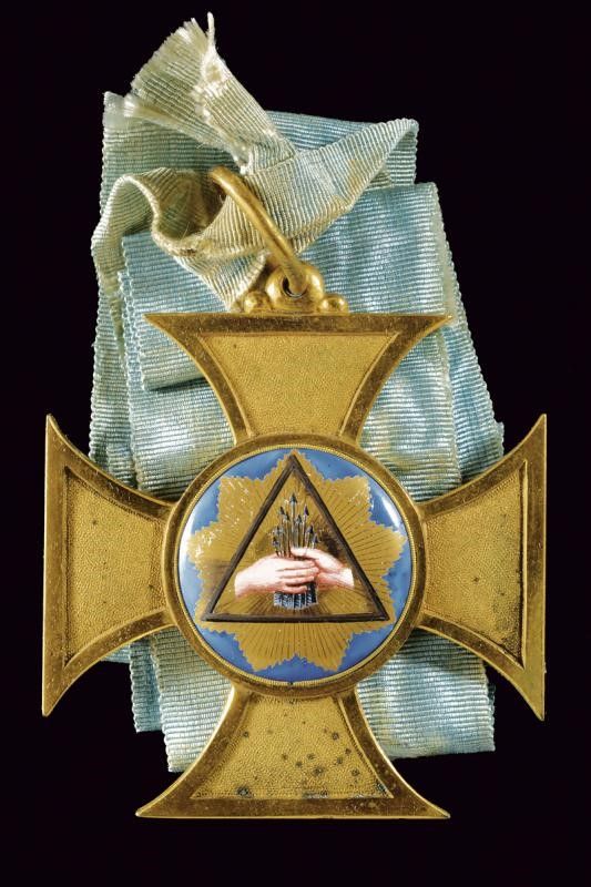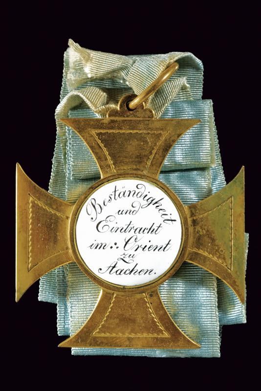 1900 circa Della loggia di Aachen, con iscrizione 'Beständigkeit und Eintracht im Orient zu Aachen'. In metallo dorato, con medaglioni smaltati. Con nastro da collo in seta originale (danneggiata) color celeste.