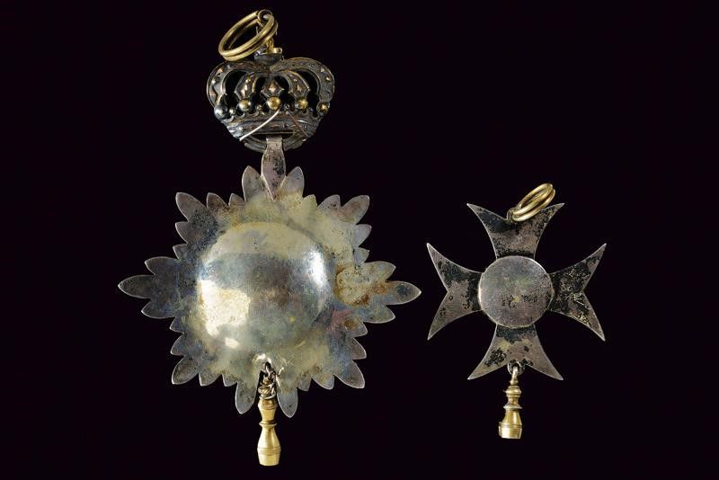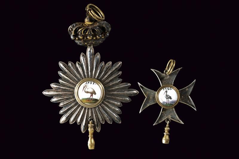 Europa, dimensioni 4.7 x 4.7 - 8 x 12 cm. XIX Secolo In argento, parzialmente smaltate. Una a stella con raggi, recante medaglione con una cicogna e numero '1847', sormontata da corona e con pendente. L'altra a croce con medaglione simile e numero '1845', con pendente.