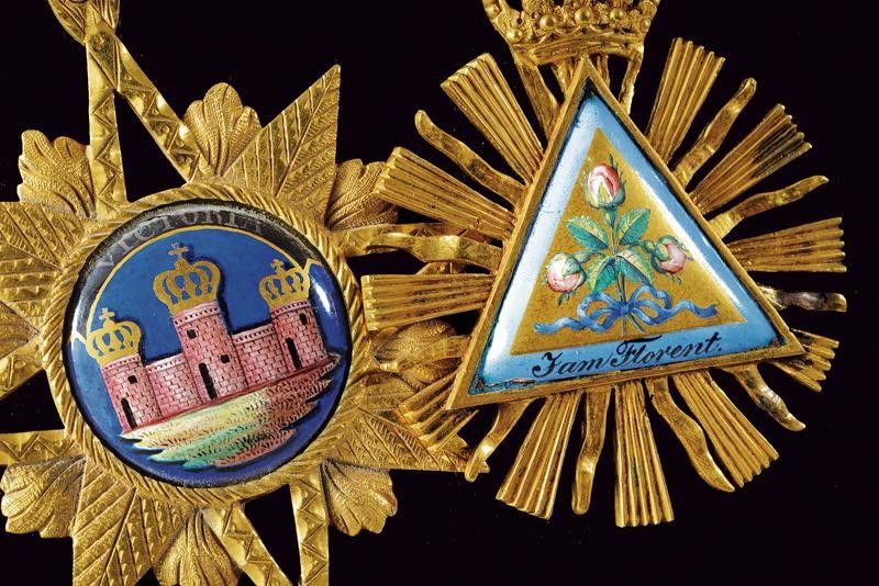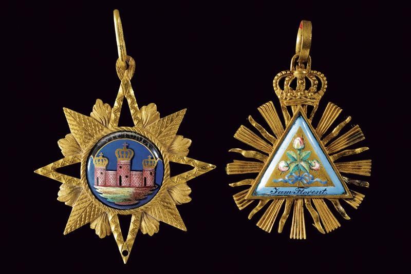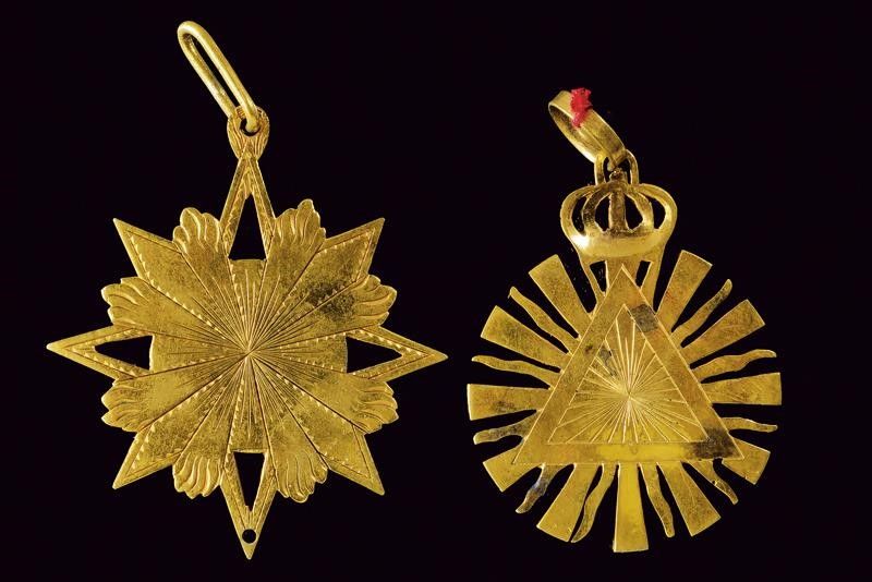 1900 circa Entrambe in metallo dorato, smaltate in policromia al centro, una sotto corona e con iscrizione 'Fam. Florent.' Entrambe con anello di sospensione.