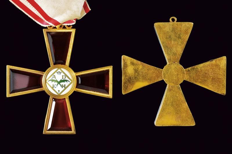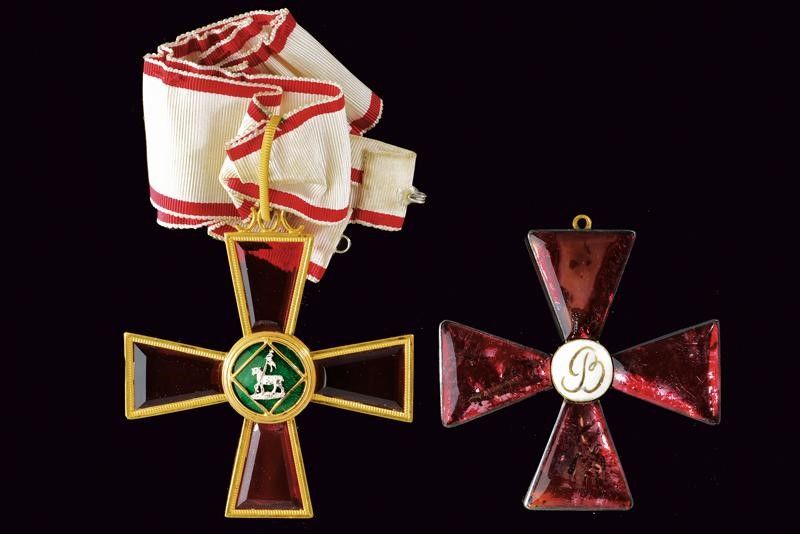 Europa, dimensioni 6.9 x 6.9 cm. XX Sec. Una con bracci della croce in vetro rosso, con medaglione smaltato e cornice in metallo dorato. Nastro da collo. L'altra a croce con bracci in vetro bianco colorato parzialmente color rosso, il medaglione smaltato e con lettera 'B'.