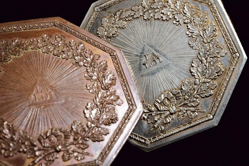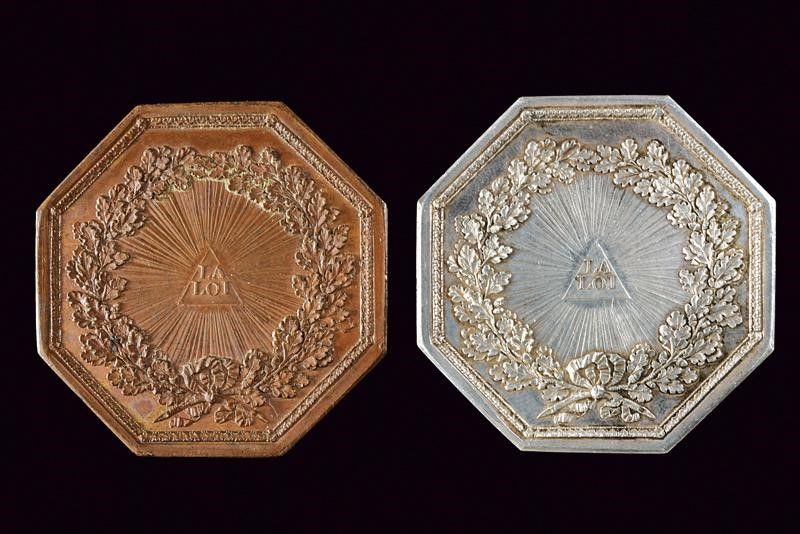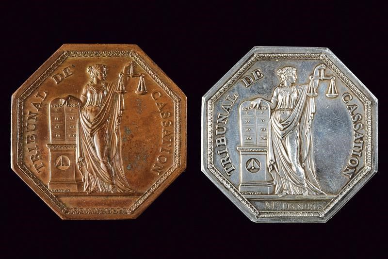Francia, diametro 4.6 cm. Inizio del XIX Secolo Una in bronzo e una in argento (56 g), entrambe di forma ottagonale. Al dritto la giustizia in piedi regge le tavole della legge poste su un altare, con la mano sinistra regge una bilancia Alla base dell'altare 'GATTEAUX. R'; al bordo 'TRIBUNAL DE CASSATI