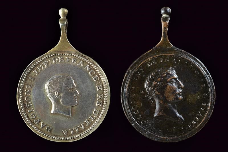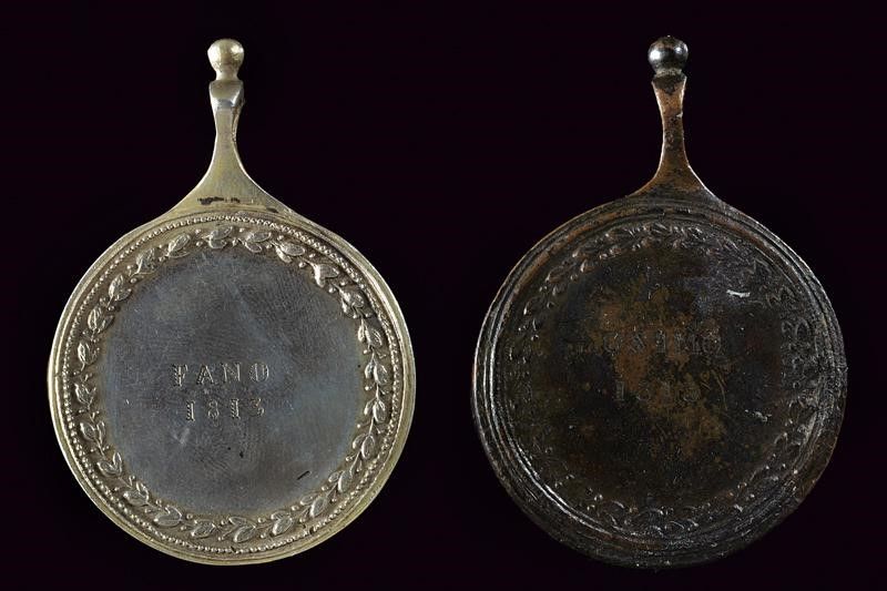 1813 Una in bronzo e una in argento. Al dritto 'NAPOLEONE I IMP DE FRANCE E RE D'ITALIA'. Al rovescio una marcata 'FANO 1813' e una 'OSIMO 1813'. Le sommità con prolungamento e foro.