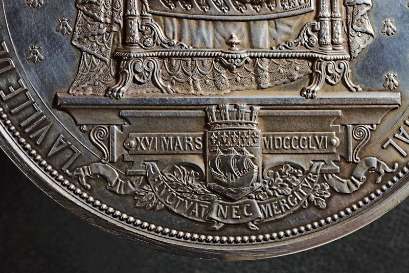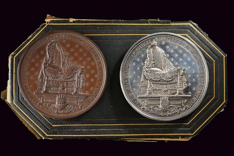 Francia, diametro 7.6 - 7.6 cm. 1856 Una in bronzo e una un argento, di eguale fattura; medaglie coniate in occasione della nascita di Napoleone Eugenio, figlio di Napoleone III. Al dritto due vittorie alate recano omaggio con rami di ulivo e di alloro al piccolo Napoleone Eugenio addormenta