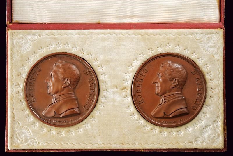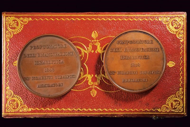 Italia, diametro 5 - 5 cm. Metà del XIX Secolo Entrambe in bronzo e di eguale fattura. Al dritto busto con sguardo verso sinistra recante al bordo il nome 'ROBERTO D'AZEGLIO', opus 'G. FERRARIS F.' Al rovescio inscrizione 'PROPUGNATORE - DELL'EMANCIPAZIONE / ISRAELITICA / 1848 / GL'ISRAELITI SUBALPINI