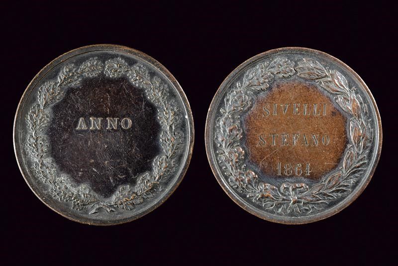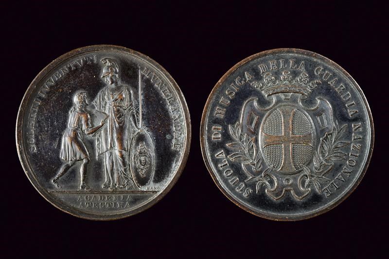 Italia, diametro 4 - 4.1 cm. Terzo quarto del XIX Secolo Una con stemma sormontato da corona e con iscrizione 'SCUOLA DI MUSICA DELLA GUARDIA NAZIONALE'; al retro iscrizione 'SIVELLI STEFANO 1864'. L'altra con effige di Minerva cinta d'elmo che regge scudo e lancia e pone una mano su un giovane il quale tiene u