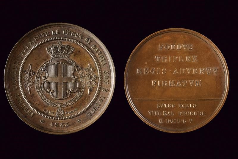 Regno di Sardegna, diametro 5.8 cm. 1855 In bronzo. La prima per commemorare la partecipazione Piemontese alla compagnia in Crimea; al dritto busto verso sinistra, al bordo 'VICTOR-EMANUEL II ROI DE SARDAIGNE'; opus 'HART'. Al rovescio stemma sabaudo tra due rametti di alloro e quercia, adornato