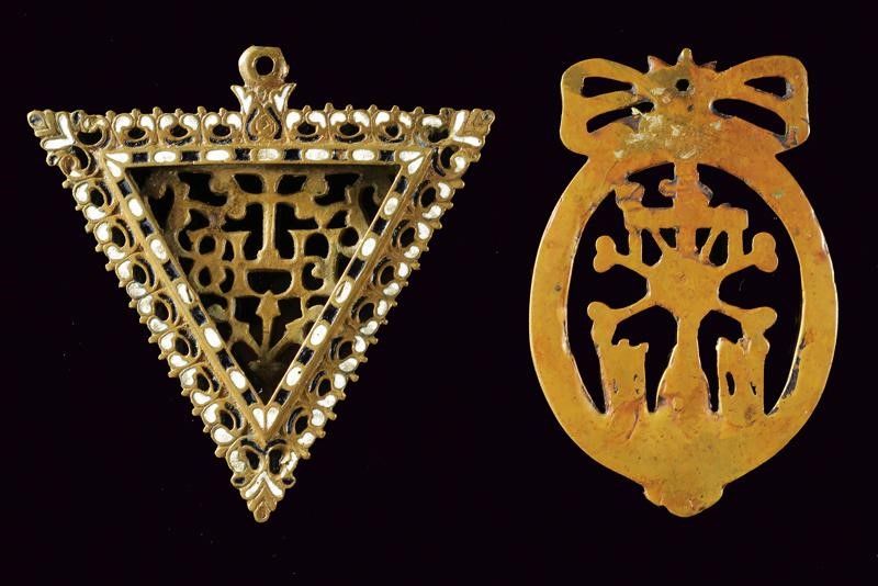 Europa, altezza 7.8 - 7.9 cm. XIX Secolo Uno a forma di triangolo rovesciato, in ottone, riccamente traforato e smaltato nei colori bianco e nero, recante al centro la croce e il cristogramma 'IHS'; anello di sospensione. L'altra in bronzo traforato, di forma ellittica, recante al centro teschio