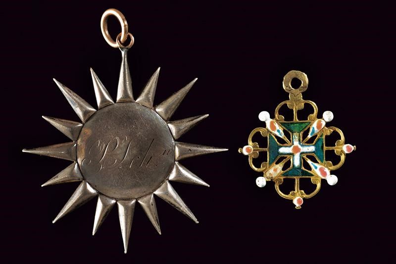 Europa, 4.4 x 4.6 e 2.7 x 3.1 cm. XIX Secolo Uno a stella, con raggi in vetro rosso (mancanze e danni), recante medaglione centrale tondo e convesso in argento, con colomba dorata ed iscrizione 'SYMBOLE DE PAIX, D'UNION ET DE SAGESSE'. Sul retro incisione 'P. SCH.n'. L'altro pendente in oro giallo,