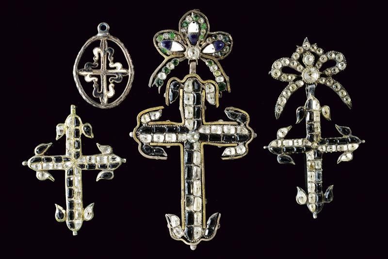 Europa, altezza 3.7 - 10.2 cm. XIX Secolo Le croci di grandezza differente, in metallo bianco, decorate con simil-pietre bianche e nere, due sormontate da un fiocco snodato. Piccole mancanze e difetti. Insieme con un medaglione ellittico traforato, con gigli smaltati in bianco e nero.