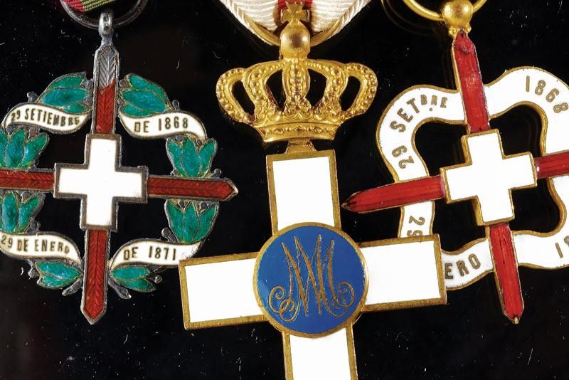 Spagna, altezza 3.2 - 3.6 cm. 1871 Ordine del Merito Militare, terzo modello, Amedeo I di Savoia (1871-1873) per tempi di pace. Insieme con la croce 1868 - 1871 'AMADEO I A LA MILICIA CIEDADANA' e la croce 'AMADEO I A LOS VOULUNTARIOS DE LA LIBERTAD'. Entrambi smaltati (piccoli chip) e con