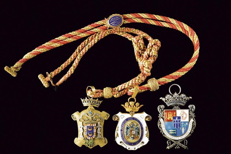 Spagna, altezza 5.8 - 6 - 6.5 cm. Seconda metà del XX Secolo In metallo parzialmente smaltato. Uno d'epoca franchista con iscrizione 'FRANCISCVS FRANCO IMP. PVBLICAE INSTITVTIONI'. Un premio al Merito 2a Categoria. L'ultimo 'VALEROSA HUMANITARIA Y MUY CARITATIVA' della città di Melilla. Di bellissima fattura. Due c