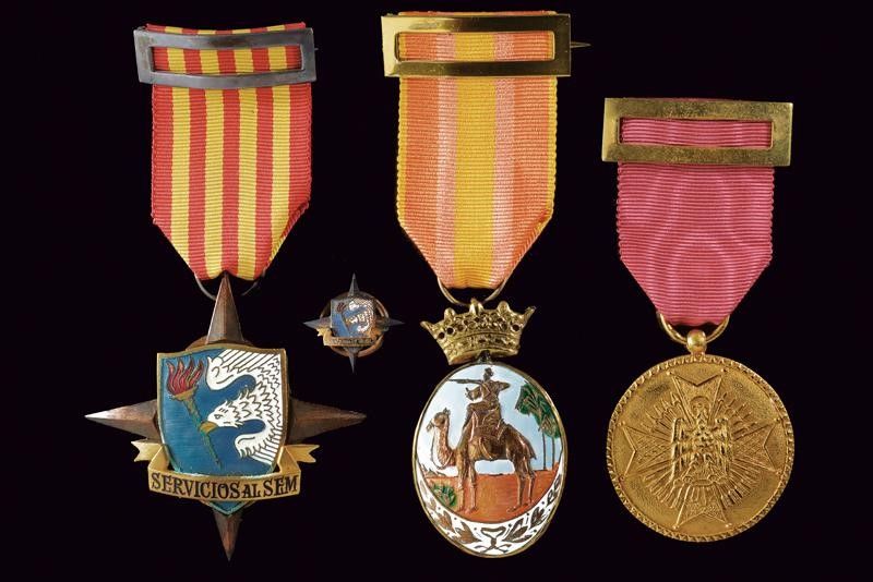 Seconda metà del XX Secolo Due in metallo smaltato, uno marcato 'IFNI SAHARA', l'altro 'SERVICIOS AL SEM' (con miniatura). L'ultimo tondo, dorato, con aquila su giogo e frecce.Tutti con nastro. Epoca Franchista.