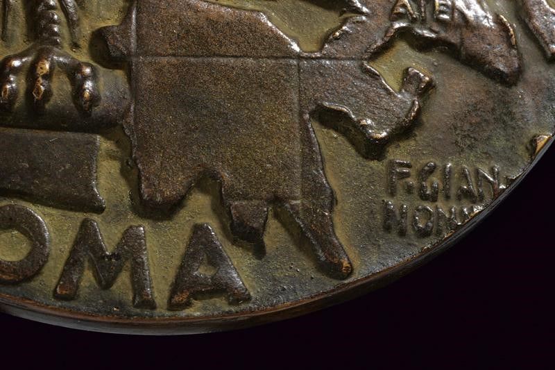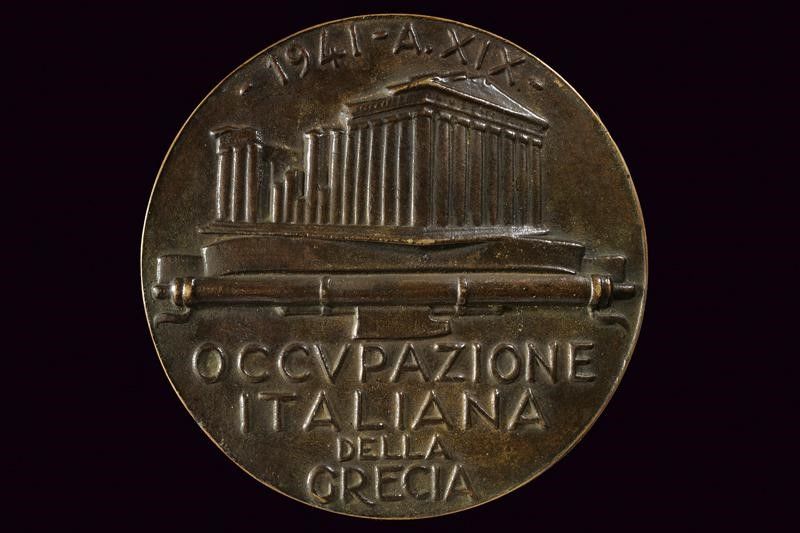 Regno d'Italia, diametro 10.1 cm. 1941 In bronzo. Al dritto aquila ad ali spiegate su rilievo geografico della Grecia, alla sommità 'ROMA' e dalla parte opposta 'DOMA'; opus 'F. GIAN / NONE'. Al rovescio raffigurazione in rilievo del Partenone posto sopra a fascio orizzontale, alla sommità '19
