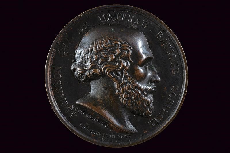 Regno delle Due Sicilie, diametro 4 cm. 1832 In bronzo. Al dritto busto verso destra, al bordo 'ALCMAEON QVI DE NATVRAE RATIONE SCRIPSIT', opus 'V. CATENACCI SCVLP / L. TAGLIONI CON. NEAP.' Al rovescio gallo che regge nastro con becco, sul nastro 'NOSCE TE IPSVM'; al bordo 'COTRONE NAT. FLORVIT AN.