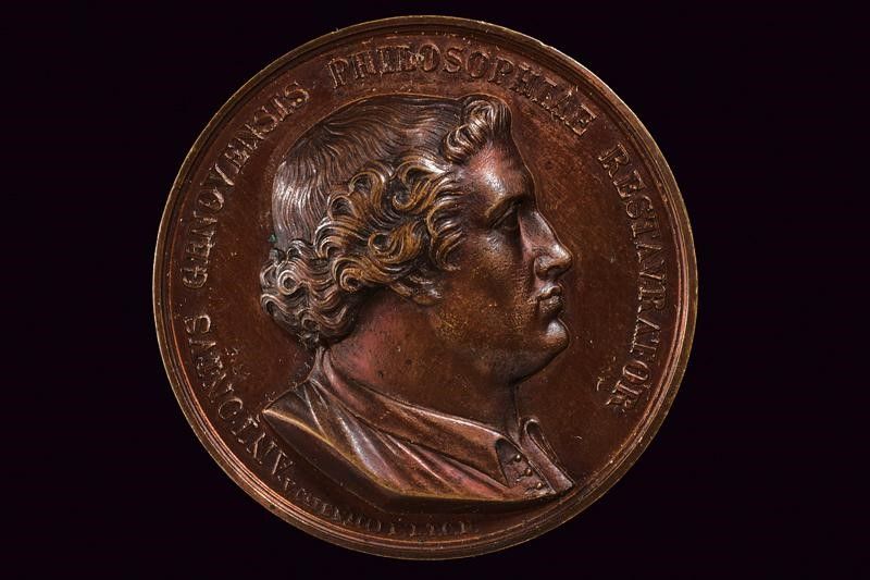 Regno delle Due Sicilie, diametro 4 cm. 1830-40 In bronzo. Al dritto busto verso destra, al bordo 'ANTONIVS GENOVENSIS PHILOSOPHIAE RESTAURATOR'; opus 'V. CATENACCI F.L.T.C.N.'. Al rovescio vaso con iscrizione sulla base 'SOPH ET COMM. SCIENT. PROECLA. RAVIT.',al bordo 'CASTILIONE AP SALERN NAT.A.C.MDC