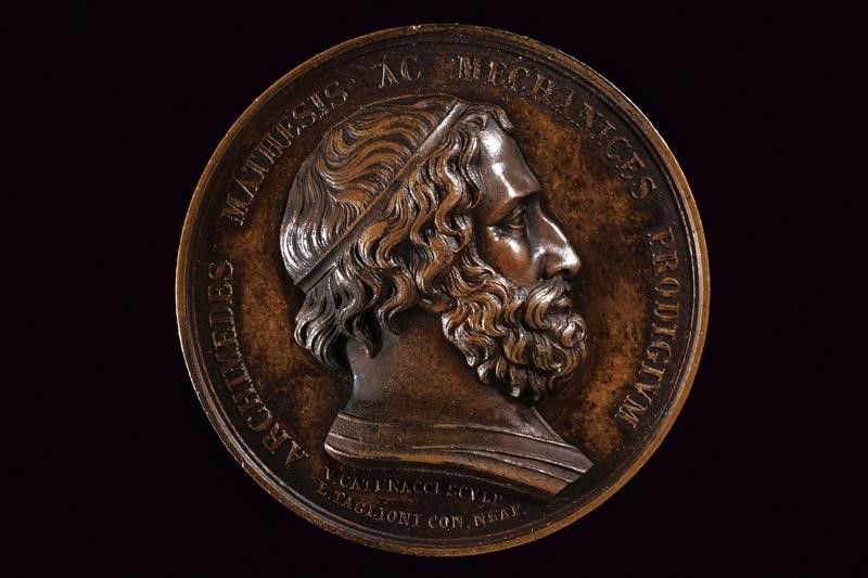 Regno delle Due Sicilie, diametro 4 cm. 1830-40 In bronzo. Al dritto busto a destra, al bordo 'ARCHIMEDES MATHESIS AC MECHANICES PRODIGIVM'; opus 'V. CATENACCI / L. TAGLIONI / A. ARNAUD'. Al rovescio fontana, al bordo 'SYRACVSIS N. A. A. C. IN VBRIS EXPVGNATIONE PEREMPTVS'.
