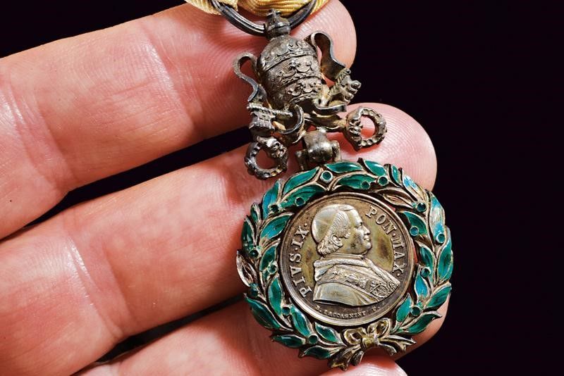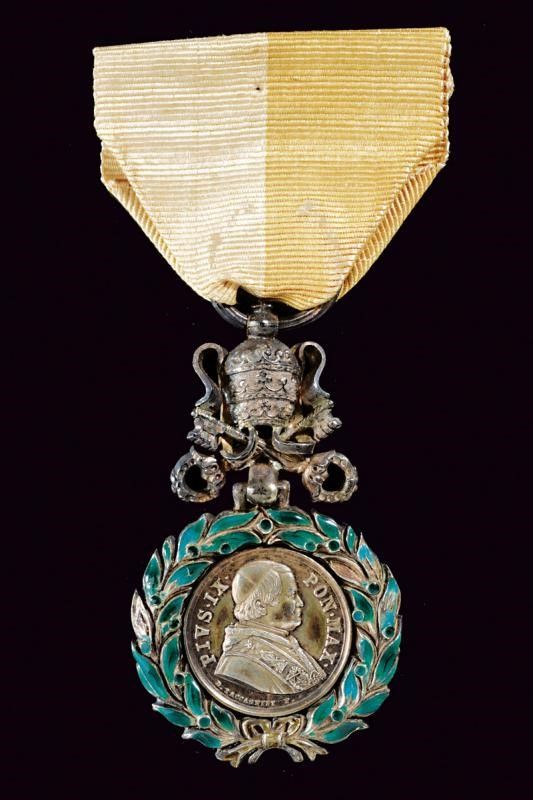 Stato Pontificio, dimensioni 3.1 x 5.2 cm. Terzo quarto del XIX Secolo Al recto busto a destra con iscrizione 'PIVS IX PON. MAX.'. Opus 'B. Zaccagnini', questo circondato da una corona di allori smaltata di verde. Al verso 'BENE/MERENTI'. Completa di trofeo civile e con nastro originale. Decorazione estremamente rara. Brambi