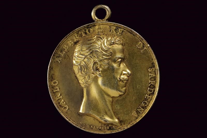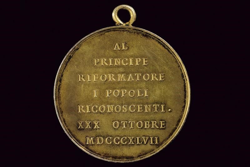 Regno di Sardegna, diametro 5 cm. 1847 In metallo dorato. Al dritto busto a destra, al bordo 'CARLO ALBERTO RE DI SARDEGNA'; opus 'G. GALEAZZI'. Al rovescio 'AL PRINCIPE RIFORMATORE I POPOLI RICONOSCENTI XXX OTTOBRE MDCCCXLVII.' Con anello alla sommità .