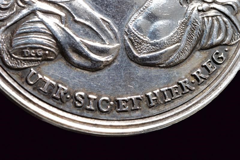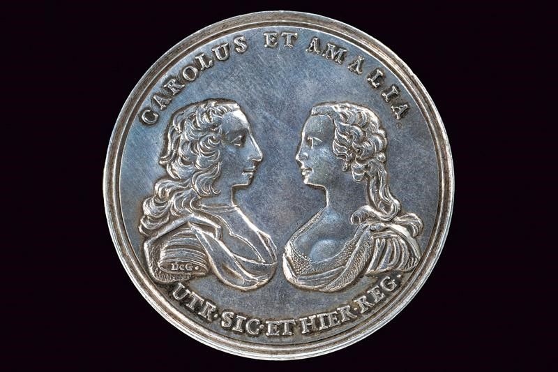 Napoli, diametro 4.1 cm. 1751 Sul recto busti affrontati del re e della regina. Iscrizione 'CAROLUS ET AMALIA UTR SIC ET HIER REG'. Opus Gaetano De Gennaro. Sul retro stemmi delle due Case sormontati da corona reale ed iscrizione 'FOELICITAS MILITUM ET POPULORUM. MDCCLI'. 30 g.