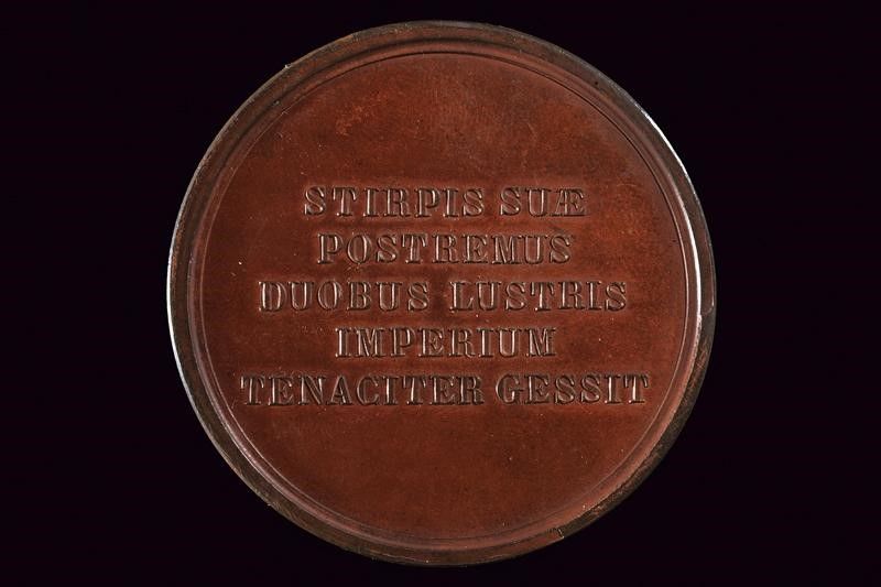 Regno di Sardegna, diametro 5.3 cm. 1820-30 Al dritto busto verso sinistra con uniforme militare, cinque decorazioni militari sul petto e collare dell'Annunziata e, al bordo, 'CAR. FŒELIX VICE EMAN. I FR. SARD. REX VI'. Al rovescio campo liscio con iscrizione 'STIRPIS SUÆ POSTREMUS DUOBUS LUSTRIS I