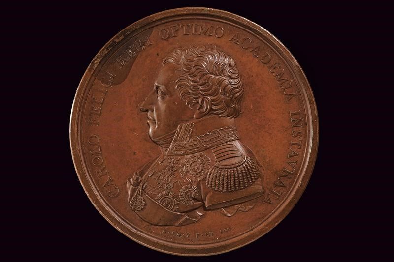 Regno di Sardegna, diametro 4.6 cm. 1822 Emessa nel 1822 per ricordare il restauro dell'Accademia di Belle Arti. Al recto busto in uniforme a sinistra. Iscrizione 'CAROLO FELICI REGI OPTIMO ACADEMIA INSTAVRATA'. Opus: A. LAVY F. ET INV. Al verso Minerva con elmo seduta verso sinistra, iscrizione