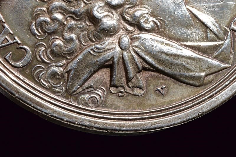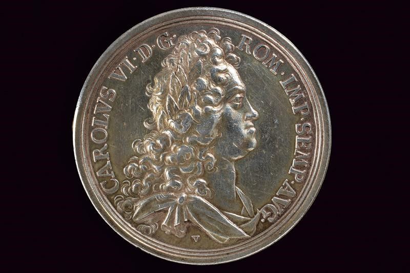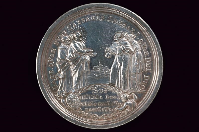 Sicilia, diametro 4.36 cm. 1720 Carlo VI si proclama legittimo Re di Sicilia. Al recto busto a destra con iscrizione 'CAROLVS VI D G ROM IMP SEMP AVG'. Sotto: V. (Van Vestner). Al verso il Redentore, in compagnia di San Pietro e altre persone davanti della città di Palermo. Iscrizione '