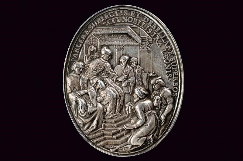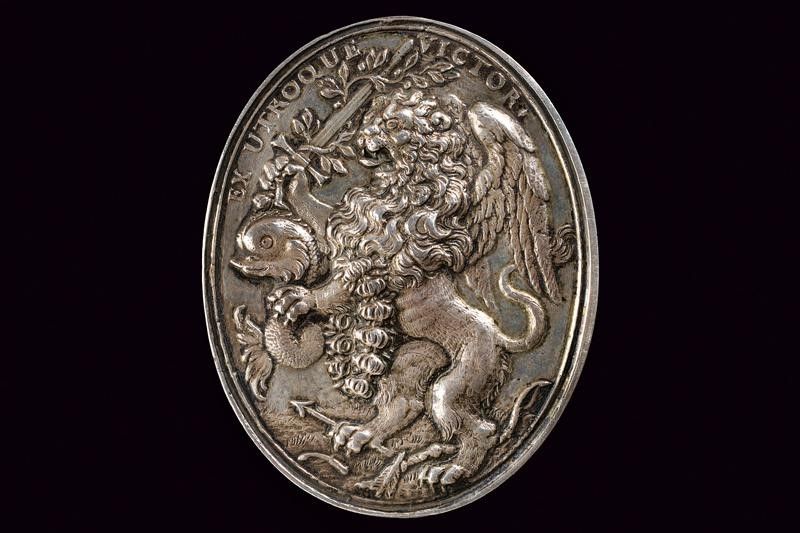 Venezia, dimensioni 5.5 x 7 cm. fine del XVII Sec. Replica della celebre medaglia coniata nella zecca di Norimberga nel 1687, Opus Georg Hautsch. In argento di forma ellittica; al recto scena del Doge che riceve la resa e l'omaggio dei fratelli Mustafà e Hassan Pascià , con iscrizione 'PARCERE SUBIECTIS ET