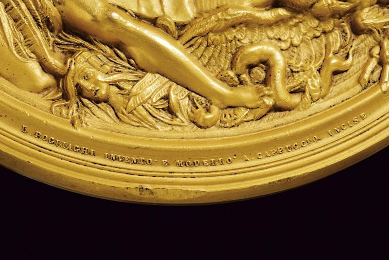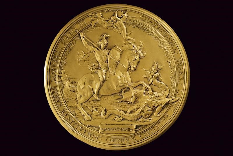 Rapallo, diametro 10 cm. 1922 Ricordo del trattato di Rapallo 1922. Al recto busto di Cristoforo Colombo sormontante un'aquila e posto fra la figure allegoriche di una indiana e una dea che si stringono la mano, in altro il globo terracqueo. Al verso San Giorgio con il drago fra ange