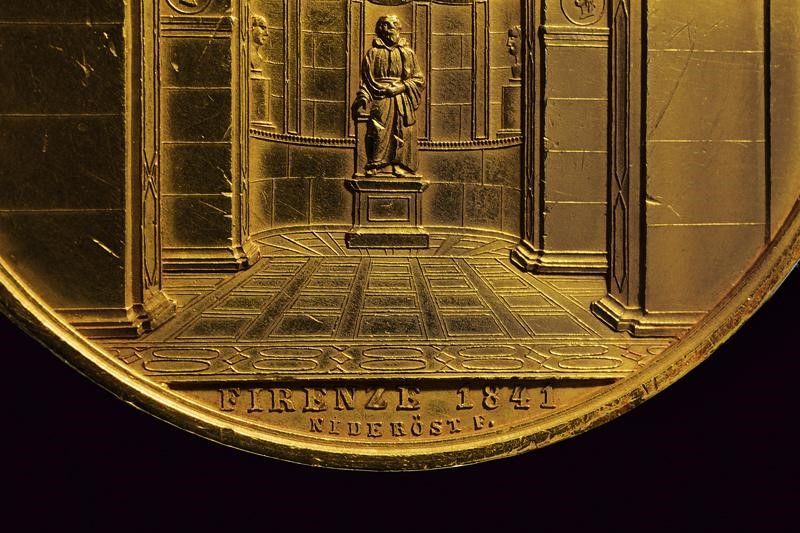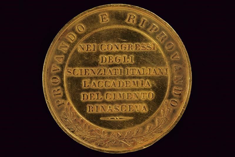 Granducato di Toscana, diametro 6.1 cm. 1841 ln argento dorato. Al dritto tribuna di Galileo, nel Museo di Fisica e Storia Naturale di Firenze. Al di sotto 'FIRENZE 1841'; opus 'NIDERĂ–ST F.' Al rovescio 'PROVANDO E RIPROVANDO' / 'NEI CONGRESSI DEGLI SCIENZIATI ITALIANI L'ACCADEMIA DEL CIMENTO RINASC