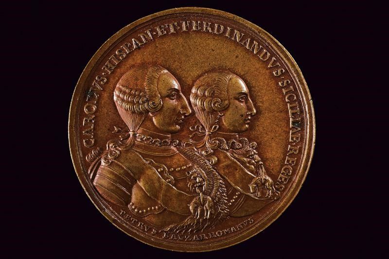 Regno di Napoli, diametro 5.3 cm. 1772 In bronzo. Al dritto busti corazzati e affiancati di Carlo III e Ferdinando IV con parrucca e collare del Toson d'Oro, al bordo 'CAROLVS. HISPAN. ET. FERDINANDVS. SICILIAE. REGES'; opus 'PETRVS BALZAR ROMANVS. '. Al rovescio prospetto anteriore del nuovo