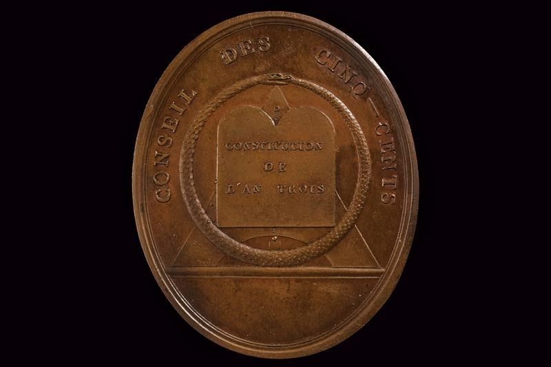 1799 In bronzo. Al dritto fascio fra fronde di quercia e di alloro, alla sommità 'REPUBLIQUE FRANCAISE' in esergo 'REPRESENTANT DU PEUPLE L'AN VII.' Al rovescio 'CONSEIL DES CINQ-CENT' e 'CONSTITUTION DE L'AN TROIS'.