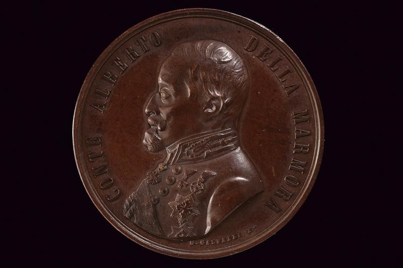 primo quarto del XVII Sec. In bronzo. Al dritto busto verso sinistra con al bordo 'CONTE ALBERTO DELLA MARMORA'; opus 'G. GALEAZZI F.' Al rovescio 'I COMUNI DELLA SARDEGNA GRATI E RICONOSCENTI 1874'