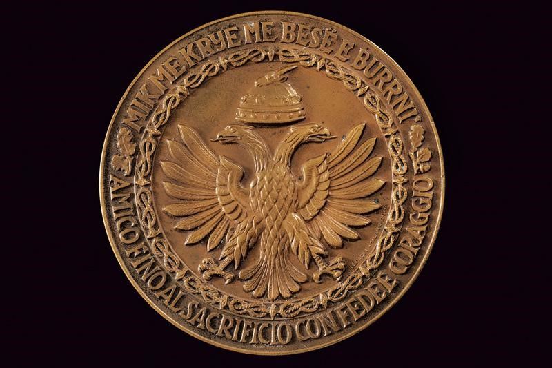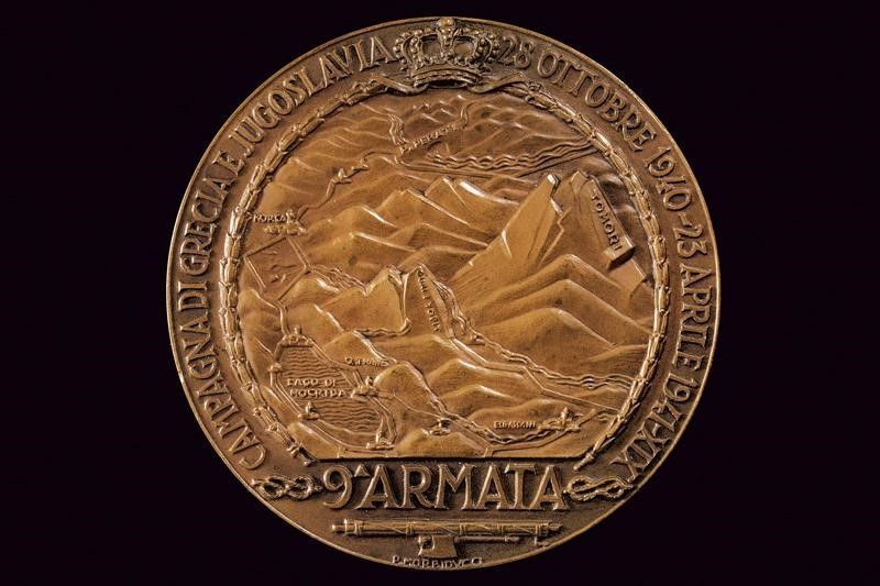 Regno d'Italia, diametro 6 cm. 1940 - 1945 circa Al dritto aquila bicipite coronata entro cornice di nodi d'amore con iscrizione 'MIK ME KRYE ME BESË E BURRNI / AMICO FINO AL SACRIFICIO CON FEDE E CORAGGIO' al bordo. Al rovescio 'CAMPAGNA DI GRECIA E JUGOSLAVIA 28 OTTOBRE 1940 - 23 APRILE 1941 - XIX', e