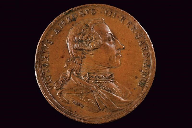 Regno di Sardegna, diametro 4.8 cm. 1778 In bronzo. Al dritto busto a destra con parrucca, armatura e mantello; al bordo 'VICTORIVS AMEDEVS III RED SARD A R VI'; opus 'LAVY'. Al rovescio la figura allegorica dell'Arte alata regge cornucopia e serto d'alloro, a terra busto, tavolozza con pennelli