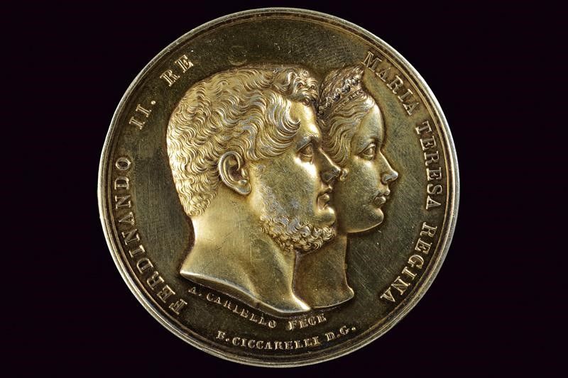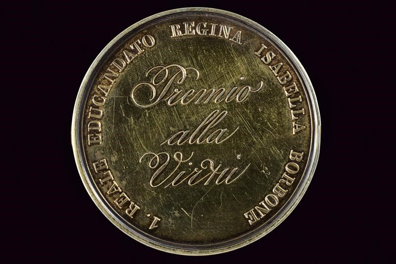Regno delle Due Sicilie, diametro 4.8 cm. 1849 In argento. Al dritto busti affiancati verso destra, al bordo 'FERDINANDO II RE MARIA TERESA REGINA'; opus 'A. CARIELLO FECE / B. CICCARELLI D.C.'. Al rovescio nel campo 'Premio alla Virtù', al bordo '1. REALE EDUCANDATO REGINA ISABELLA BORBONE'.