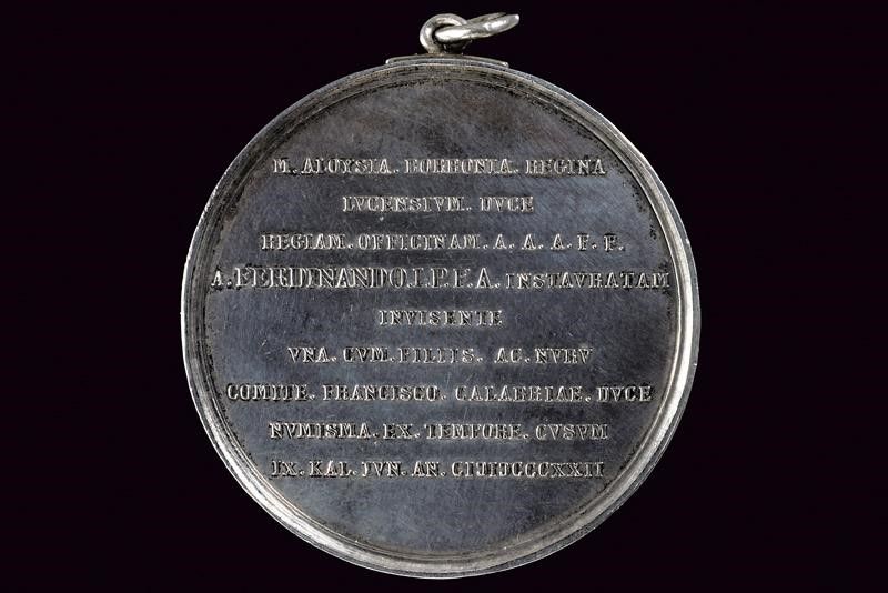 Regno delle Due Sicilie, diametro 4.8 cm. 1822 Per la visita della Duchessa di Lucca Maria Luigia alla Zecca di Napoli. Sul recto testa con corona a destra in altorilievo con iscrizione 'FERDINADVS I. D. G. REGNI SICILIARVM ET HIERVSALEM REX P. F. A.'. Sul retro iscrizione 'ALOYSIA. BORBONIA.REGINA/LV